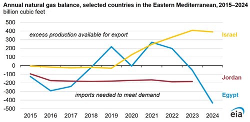 This year, Egypt is seeking to address any shortfall in natural gas supply by ramping up import purchases of liquefied natural gas (LNG). It is also chartering three additional floating storage regasification units (FSRUs) that are scheduled to begin operations in Ain Sukhna on the Gulf of Suez and in Damietta on the Mediterranean Sea by the end of third-quarter 2025. A fourth FSRU, the Höegh Gandria, is scheduled to replace the Höegh Galleon, which has been operating at the Port of Sumed near Ain Sukhna, in fourth-quarter 2026.