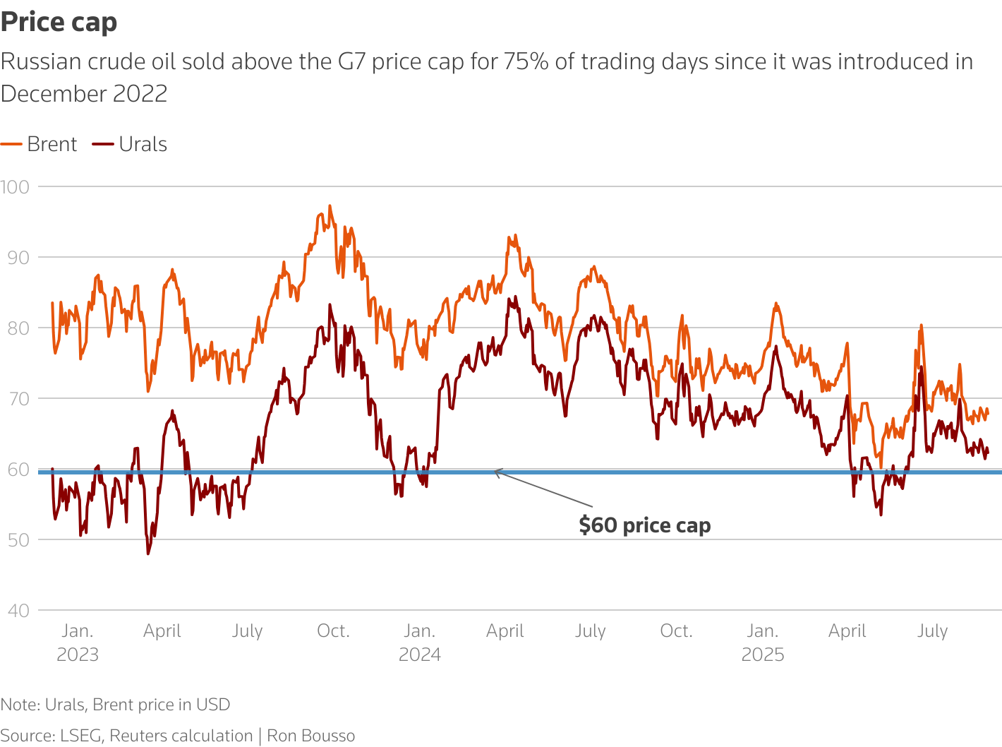But the impact has been less than expected. Russian Urals crude has traded above the $60 cap for 75% of the trading days since the measure took effect in December 2022, according to Reuters calculations, largely due to the use of dark fleets. And in August, the Urals discount to Brent narrowed to under $5 a barrel, the smallest since the war began.