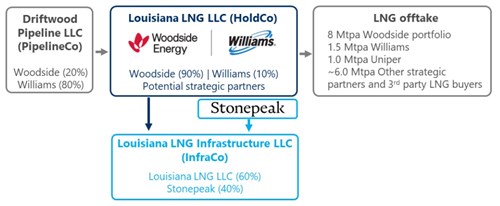 • Williams will hold 10% equity in Louisiana LNG LLC (HoldCo), with the remaining 90% of HoldCo currently owned by Woodside.