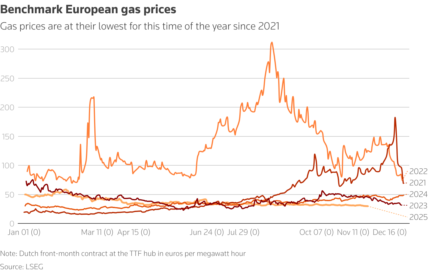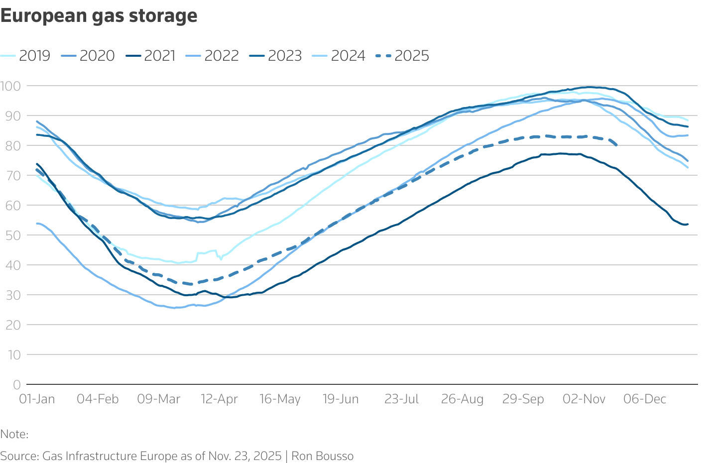 Benchmark TTF European gas prices traded below €30 per megawatt hour this week, the lowest for this season since before Russia's full-scale invasion of Ukraine in February 2022. Prices also slipped 2% on Tuesday after reports that Kiev had backed parts of the deal.