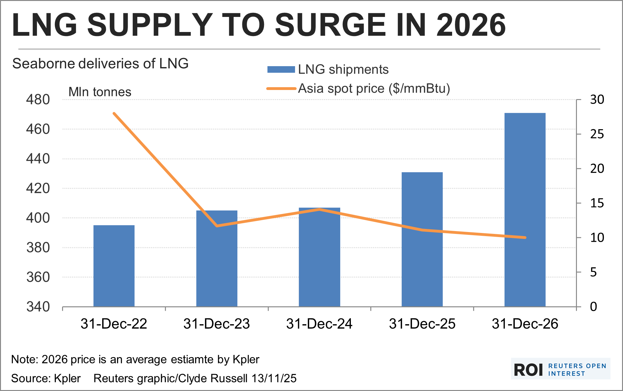 Such a jump in supply is likely to weigh on prices, with Kpler forecasting that benchmark Asian spot prices LNG-AS will average $10 per million British thermal units (MMBtu) in 2026, down from about $12 in 2025.