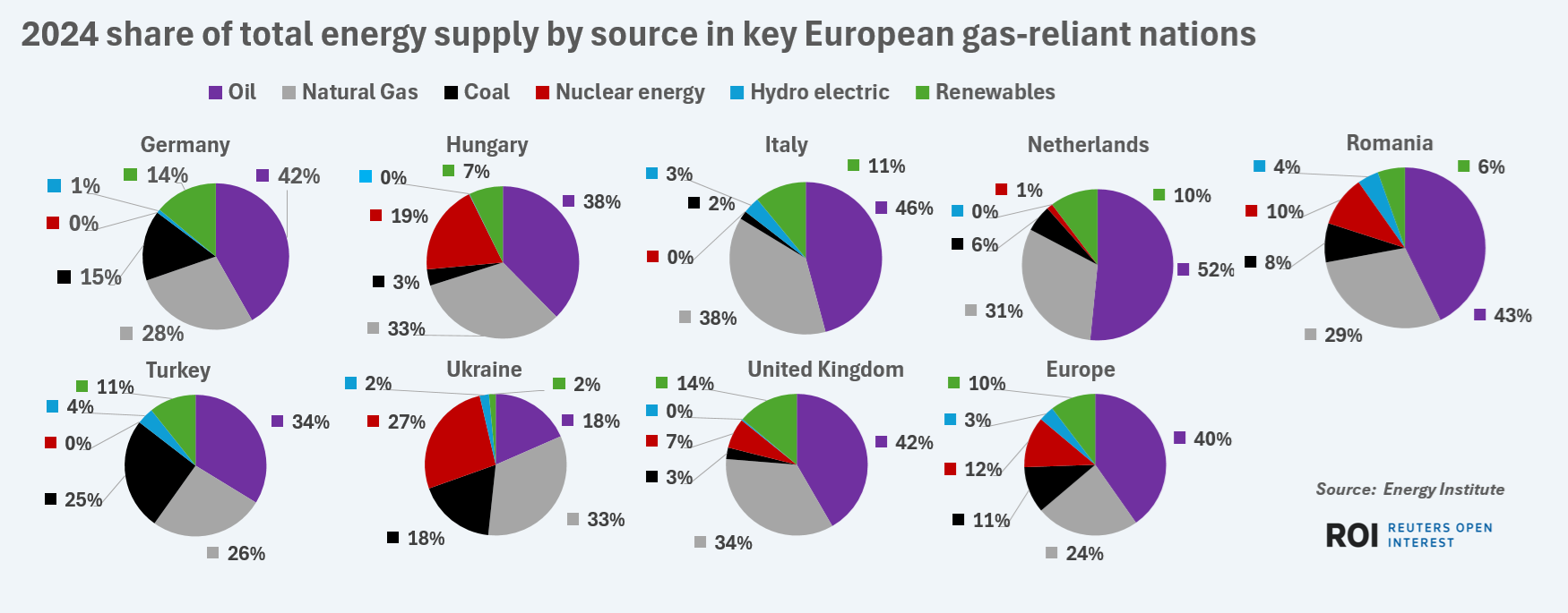 The United Kingdom, Ukraine, Hungary and the Netherlands round out the top five most gas-reliant nations in terms of gas's share of the total energy supply mix.