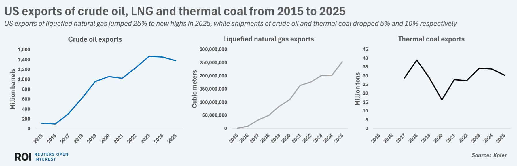 Fossil exports. LNG was the star of the U.S. energy export arena in 2025, with a record 252 MMm3 shipped out, according to commodities intelligence firm Kpler.