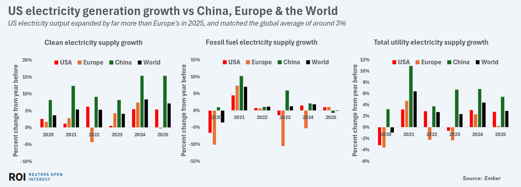 Electric growth. Total U.S. electricity generation by utilities climbed by 3% in 2025 from the year before, which marks the second straight year that wholesale electricity output posted a 3% or better rise, data from Ember showed.