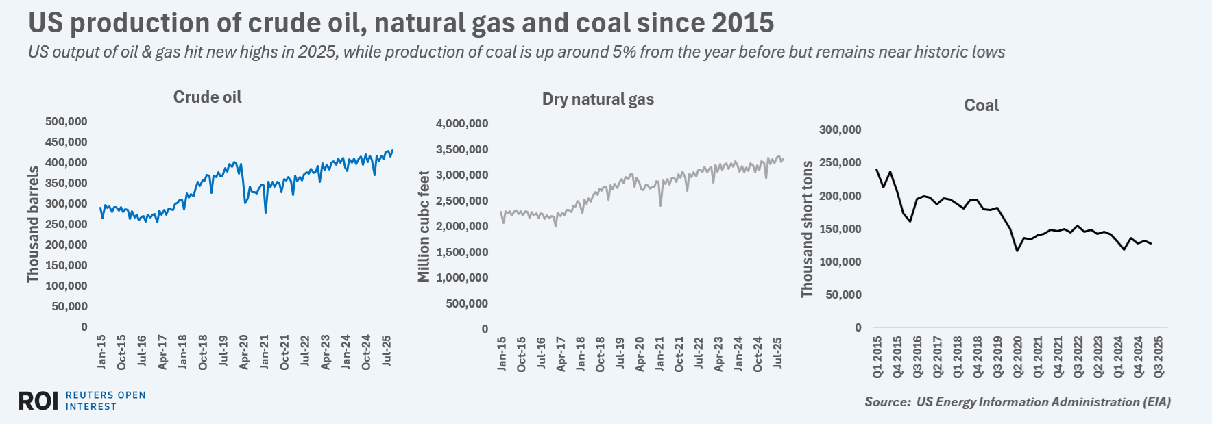 The output of coal also increased in 2025 - by around 5% from the year before - but total U.S. coal production remains well below the levels of a decade ago due to reduced use in the domestic power generation system.