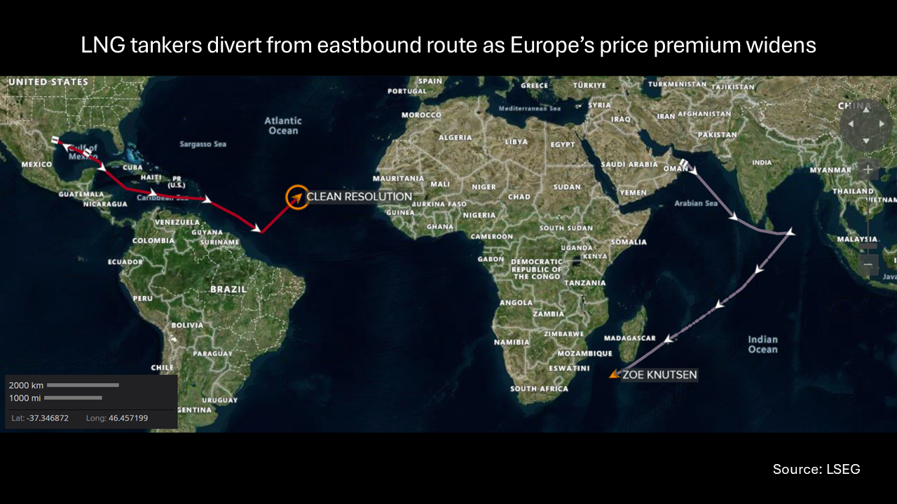 LNG tankers divert from eastbound route as Europe premium widens