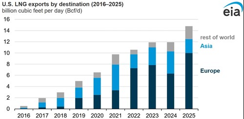 Before the war in Ukraine began in 2022, Asia received the most volumes of U.S. LNG exports, averaging 46% from 2017 through 2021. Following Russia’s invasion of Ukraine, exports to Europe increased, and in 2022, Europe received 69% of all LNG exports from the United States, up from 34% in 2021. From January through November 2025, Europe received 68% of U.S.-origin volumes.