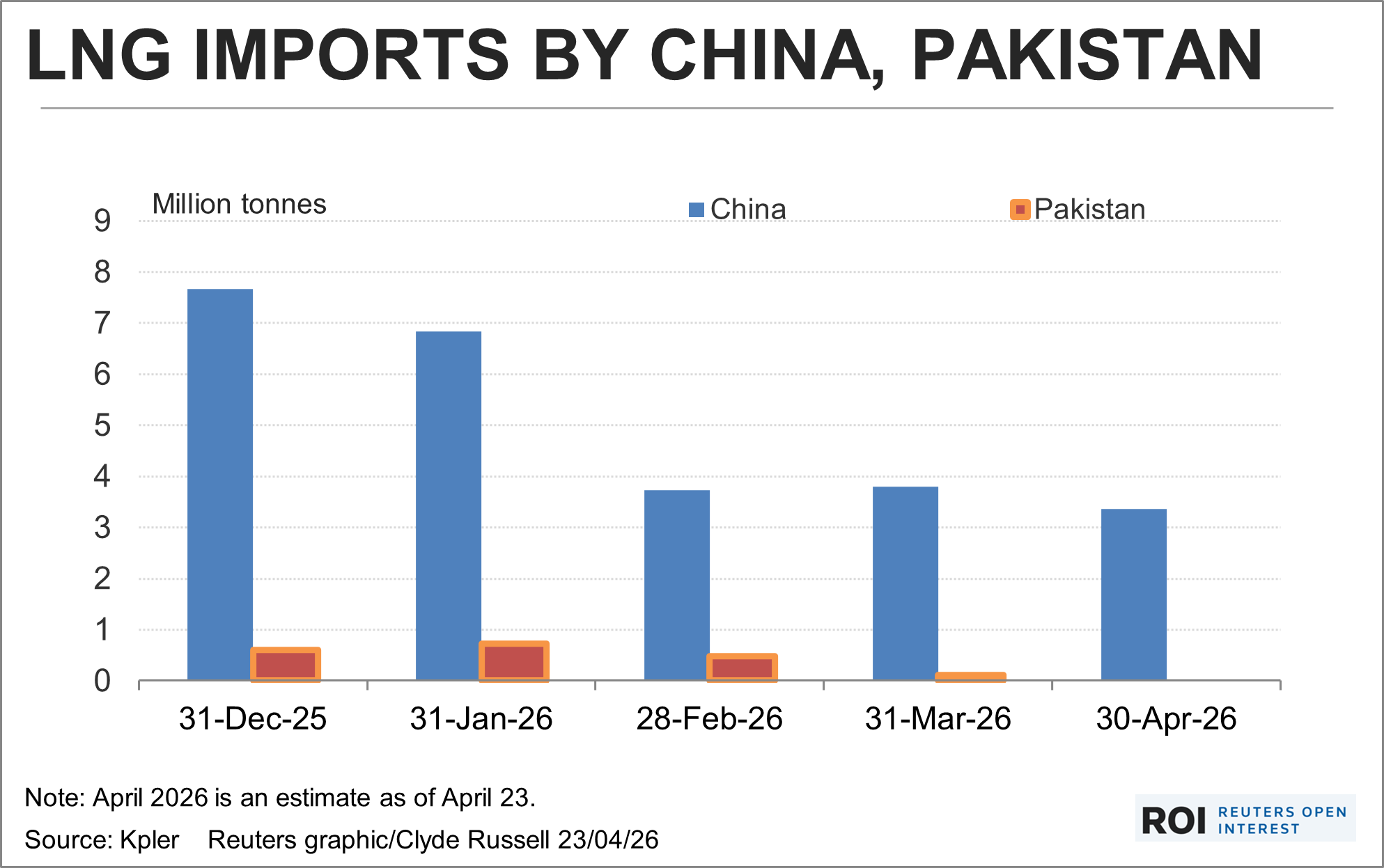 Kpler estimates China's LNG imports at 3.36 million tons in April, the lowest since 3.18 million tons in April 2018 and down from the winter peak of 7.66 million tons in December.